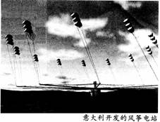 ⑤据报道,俄罗斯物理学家在这方面作过探索。他们将50个巨大的风筝,放到空中从上至下排成一串,看上去就像一架通天的梯子。每个风筝伸展开来足有足球场那么大。而牵扯这些风筝的绳索约有6000米长,路灯杆那么粗。假如风筝所在高度的风力不足的话,人们还可以放松绳索使风筝升高。意大利科研人员计划建造发电能力在几兆千瓦范围的大型设备,并在计算机上成功地进行了模拟计算。设想的风筝发电装置,在风力作用下能够带动固定在地面的旋转木马式的转盘,转盘在磁场中旋转而产生电能。这种风筝重量轻,抵抗力超强,可升至2000米的高空。一个直径1000米的巨轮便可以提供250兆瓦的发电能力。这将是第一台发电能力和常规电站不相上下的可再生能源发电设备。