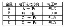 18.(8分)将洁净的金属片A、B 、C、D 分别放置在浸有盐溶液的滤纸上面并压紧(如图所示)。在每次实验时,记录电压指针的移动方向和电压表的读数如右表所示: