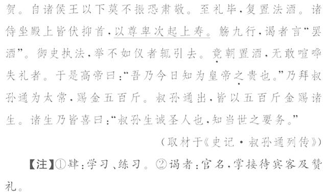 [解析]选B。②写的是高帝的做法,据此可排除A、C两项;⑤写的是长乐宫成后,在“治礼”过程中不合仪礼者都引去,不能说明其“有眼光、识时务”,据此可排除D项。高&考%资(源#网