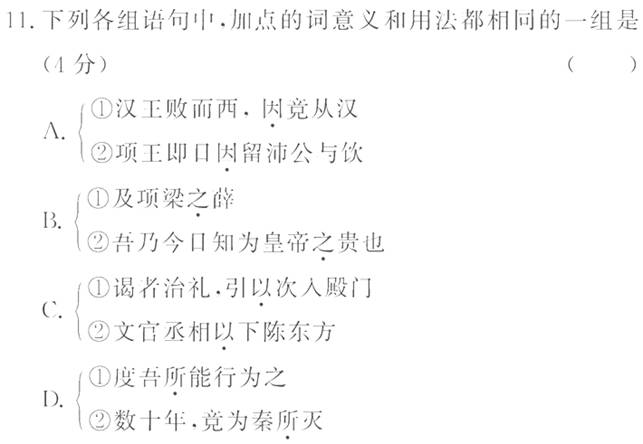 10.下列语句中,加点的词的解释不正确的一项是(4分)( )