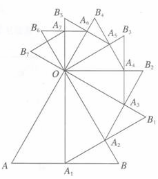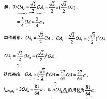 (2)若再以OA2为边按逆时针方向作等边△OA2B2,A2B2与OB1相交于点A3,按此作法进行下去,得到△OA3B3,△OA4B4,┉,△OAnBn,(如图),求△OA6B6,的周长。