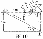 例8 (2008长沙)如图10所示,某超市在一楼至二楼之间安装有电梯,天花板与地面平行,请你根据图中数据计算回答:小敏身高1.78米,她乘电梯会有碰头危险吗?姚明身高2.29米,他乘电梯会有碰头危险吗?(可能用到的参考数值: