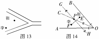,张、李两村座落在两相交公路内(如图13所示).医疗站必须满足下列条件:①使其到两公路距离相等,②到张、李两村的距离也相等,请你通过作图确定P点的位置.