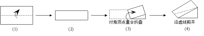 8、如图,小亮拿一张矩形纸图(1),沿虚线对折一次得图(2),下将对角两顶点重合折叠得图(3)。按图(4)沿折痕中点与重合顶点的连线剪开,得到三个图形,这三个图形分别是( )