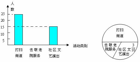 21.(本小题8分)今年3月5日,花溪中学组织全体学生参加了“走出校门,服务社会”的活动.九年级一班高伟同学统计了该天本班学生打扫街道,去敬老院服务和到社区文艺演出的人数,并做了如下直方图和扇形统计图。请根据高伟同学所作的两个图形.
