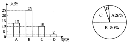 (8分)某校为了了解九年级学生体育测试成绩情况,以九年(1)班学生的体育测试成绩为样本,按A,B,C,D四个等级进行统计,并将统计结果绘制如下两幅统计图,请你结合图中所给信息解答下列问题: