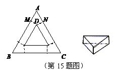 15.用一块等边三角形的硬纸片(如左图)做一个底面为等边三角形且高相等的无盖的盒子(边缝忽略不计,如右图),在△ABC的每个顶点处各剪掉一个四边形,其中四边形AMDN中,∠MDN的度数为__________.
