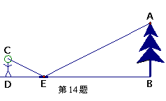 14、为了测量校园水平地面上一棵不可攀的树的高度,学校数学兴趣小组做了如下 的探索:根据光的反射定律,利用一面镜子和一根皮尺,设计如下图所示的测量方案:把一面很小的镜子放在离树底(B)8.4米的点E处,然后沿着直线BE后退到点D,这时恰好在镜子里看到树梢顶点A,再用皮尺量得DE=2.4米,观察者目高CD=1.6米,则树AB的高度为 米.