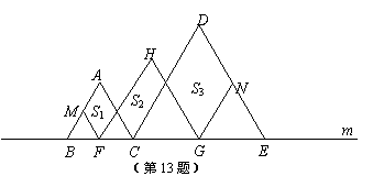 如图,在直线m上摆放着三个正三角形:△ABC、△HFG、△DCE,已知BC=CE,F、G分别是BC、CE的中点,FM∥AC,GN∥DC.设图中三个平行四边形的面积依次是S1,S2,S3,若S1+S3=10,则S2=
