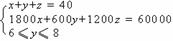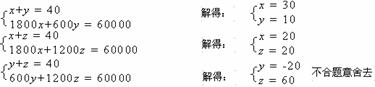 例6、(2004 哈尔滨) “利海”通讯器材商场,计划用60000元从厂家购进若干部新型手机,以满足市场需求,已知该厂家生产三种不同型号的手机,出厂价分别为甲种型号手机每部1800元,乙种型号手机每部600元,丙种型号手机每部1200元.