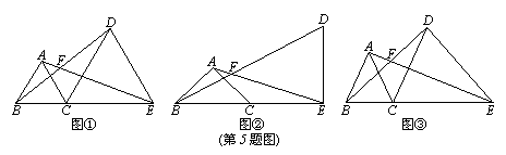 (3)将图③中的△ABC绕点C旋转(点F不与点A、B重合),得图④或图⑤。在图④中,∠AFB与∠α的数量关系是________________;在图⑤中,∠AFB与∠α的数量关系是________________。请你任选其中一个结论证明。