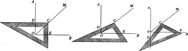 11、(06年鸡西)已知∠AOB=900,在∠AOB的平分线OM上有一点C,将一个三角板的直角顶点与C重合,它的两条直角边分别与OA、OB(或它们的反向延长线)相交于点D、E.