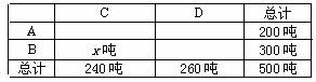 3.(·咸宁市)“5·12”四川汶川大地震的灾情牵动全国人民的心,某市A、B两个蔬菜基地得知四川C、D两个灾民安置点分别急需蔬菜240吨和260吨的消息后,决定调运蔬菜支援灾区.已知A蔬菜基地有蔬菜200吨,B蔬菜基地有蔬菜300吨,现将这些蔬菜全部调往C、D两个灾民安置点.从A地运往C、D两处的费用分别为每吨20元和25元,从B地运往C、D两处的费用分别为每吨15元和18元.设从B地运往C处的蔬菜为x吨.![]()