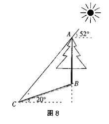 20.(本小题8分)如图8,在一个坡角为20º的斜坡上方有一棵树,高为AB,当太阳光线与水平线成52º角时,测得该树在斜坡上的树影BC的长为10m,求树高AB(精确到0.1m)中考资源网.