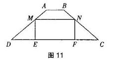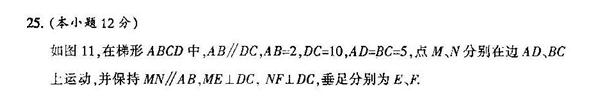 25.(本小题12分)如图11,在梯形ABCD中,AB∥CD,AB=2,DC=10,AD=BC=5,点M、N分别在边AD、BC上运动,并保持MN∥AB,ME⊥DC,NF⊥DC,垂中分别为E、F.