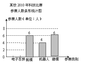 (10分) “知识改变命运,科技繁荣祖国”.我国中小学每年都要举办一届科技比赛.下图为我市某校2010年参加科技比赛(包括电子百拼、航模、机器人、建模四个类别)的参赛人数统计图: