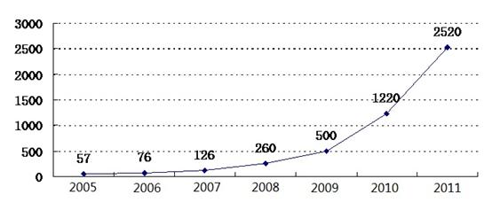 2005年---2011年中国风力发电装机容量统计图(单位:万千瓦)