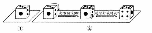 ,如图 ① .在图 ② 中,将骰子向右翻滚 90 。,然后在桌面上按逆时针方向旋转 90