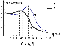 7.根据生物学研究结果,青春期男女生身高增长速度呈现如下图规律,由图可以判断,下列说法错误的是:
