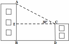 17、(2011•达州)我市某建筑工地,欲拆除该工地的一危房AB(如图),准备对该危房实施定向爆破.已知距危房AB水平距离60米(BD=60米)处有一居民住宅楼,该居民住宅楼CD高15米,在该该住宅楼顶C处测得此危房屋顶A的仰角为30°,请你通过计算说明在实施定向爆破危房AB时,该居民住宅楼有无危险?(在地面上以点B为圆心,以AB长为半径的圆形区域为危险区域,参考数据: