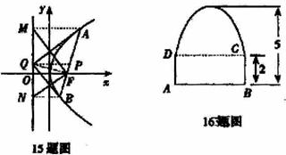 (15)已知抛物线y2=2px(p>0),过焦点F的直线交抛物线于A、B两点,线段AB的中点为P,抛物线的准线为l,分别过A、B、P作x轴的平行线依次交l于M、N、Q,连FM、FN、FQ、AQ和BQ,则这些线段中互相垂直的有 AQ⊥BQ、BQ⊥NF、AQ⊥MF .(至少找出三对)