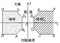 12.某校兴趣小组运用计算机对轮船由海上行驶入内陆海湾进行了一次模拟试验。如图,内陆海湾的入口处有暗礁,图中阴影所示的区域为暗礁区,其中线段AA1、B1B、CC1、D1D关于坐标轴或原点对称,线段B1B的方程为