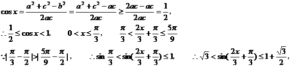 说明:本题综合运用了三角函数、余弦定理、基本不等式等知识,还需要利用数形结合的思想来解决函数值域的问题,有利于培养学生的运算能力,对知识进行整合的能力。