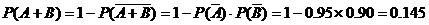 解 设“第一道工序出现次品“为事件A,“第二道工序出现次品”为事件B,“至少有一道工序出现次品”该产品就是次品,所求概率为![]()