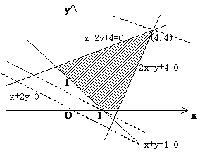 例如:已知动点(x,y)所在区域是如图所示的阴影部分(包括边界),则目标函数z=x+2y的最小值和最大值分别为_____________。