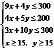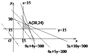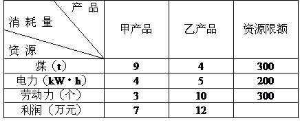 例10. 某工厂有甲、乙两种产品,计划每天各生产量不少于15t,已知生产甲产品1t,需煤9t,电力4kW·h,劳动力3个;生产乙产品1t需煤4t,电力5kW·h,劳动力10个。甲产品每1t利润7万元,乙产品每1t利润12万元,但每天用煤不超过300t,电力不超过200kW·h,劳动力只有300个,问每天各生产甲、乙两种产品多少,能使利润总额达到最大?