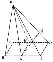 17、已知四棱锥P-ABCD(如图),底面是边长为2的正方形. 侧棱PA⊥底面ABCD,M、N分别为AD、BC的中点. MQ⊥PD于Q,直线PC与平面PBA所成角的正弦值为![]()