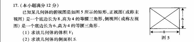 注重培养学生的空间想象能力,画出简单空间图形的三视图与直观图,且会把三视图、直观图还原成空间图形。例如07年广东高考文科第17题: