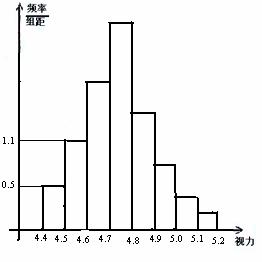 8.为了解某校高三学生的视力情况,随机地抽查了该校100名高三学生的视力情况,得到频率分布直方图,如右,由于不慎将部分数据丢失,但知道后5组的频数成等比数列,设视力在4.6到