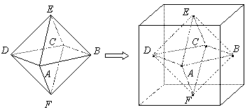 两个相同的正四棱锥底面重合组成一个八面体,可放于棱长为