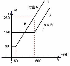 20、(4+6+4)电信局根据市场客户的不同需求,对某地区的手机套餐通话费提出两种优惠方案,则两种方案付电话费(元)与通话时间(分钟)之间的关系如图所示(实线部分)(MN平行CD)