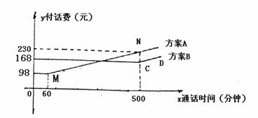 电信局为了配合客户的不同需要,设有A、B两种优惠方案,这两种方案的应付电话费(元)与通话时间(分钟)之间的关系如图所示(实线部分)(注:图中MN//CD).试问:
