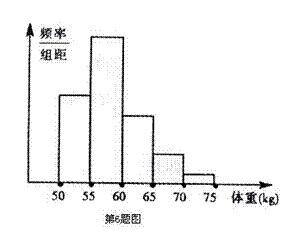 6.某校对高三年级的学生进行体检,现将高三男生的体重(单位:㎏)数据进行整理后分成五组,并绘制频率分布直方图(如图所示)。根据一般标准,高三男生的体重超过65㎏属于偏胖,你于55㎏属于偏瘦,已知图中从左到右第一、第三、第四、第五小组的频率分别为0.25、0.20、0.10、0.05,第二小组的频率数为400,则该校高三年级的男生总数和体重正常的频率分别为 ( )