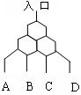 如图为类似课本研究性学习课题《杨辉三角》中的竖直平面内的一些通道,图中线条均表示通道,一钢球从入口处自上而下沿通道自由落入C处的概率是