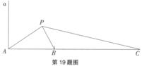 17. 如图,a是海面上一条南北方向的海防警戒线,在a上一点A处有一个水声监测点,另两个监测点B,C分别在A的正东方20km和54km处。某时刻,监测点B收到发自静止目标P的一个声波,8s后监测点A,20s后监测点C相继收到这一信号。在当时的气象条件下,声波在水中的传播速度是1.5km/s.