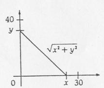 则他俩所有可能的距离的数据构成有序点对(x,y),这里x,y都在它们各自的限制范围内,则所有这样的有序数对构成的集合即为基本事件组对应的几何区域,每一个几何区域中的点都代表莉莉和霍伊的一个特定的位置, 他们可以通过对讲机交谈的事件仅当他们之间的距离不超过25公里时发生(如右图)因此构成该事件的点由满足不等式