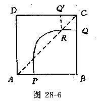 ③ Q在邻边BC或AD之一上(图28-6).令曲线PQ与AC的一个公共点为R,以AC为对称轴作出RQ的对称图形