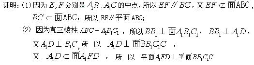 解析:本题考查线面垂直证明线面夹角的求法,第一问可取BC中点F,通过证明AF⊥平面BCC1,再证AF为BC的垂直平分线,第二问先作出线面夹角,即证四边形AFED是正方形可证平面DEF⊥平面BDC,从而找到线面夹角求解。此题两问也可建立空间直角坐标系利用向量法求解。