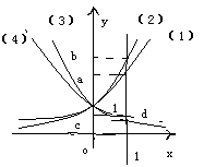 下图是指数函数(1)y=ax,(2)y=bx,(3)y=cx,(4)y=dx的图像,则a、b、c、d与1的大小关系是( )