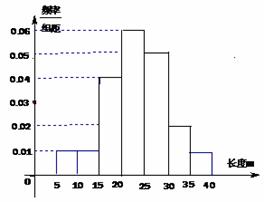 4. (2010江苏卷)4、某棉纺厂为了了解一批棉花的质量,从中随机抽取了100根棉花纤维的长度(棉花纤维的长度是棉花质量的重要指标),所得数据都在区间[5,40]中,其频率分布直方图如图所示,则其抽样的100根中,有_▲___根在棉花纤维的长度小于20mm。