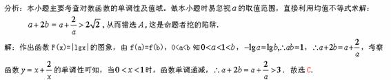 7.C[命题意图]本小题主要考查对数函数的性质、函数的单调性、函数的值域,考生在做本小题时极易忽视a的取值范围,而利用均值不等式求得a+b=