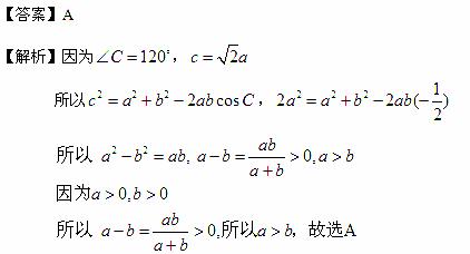 [命题意图]本题考查余弦定理,特殊角的三角函数值,不等式的性质,比较法,属中档题。