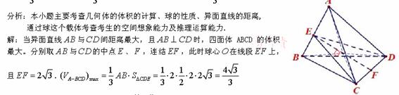 26、(2010全国卷1理数)(12)已知在半径为2的球面上有A、B、C、D四点,若AB=CD=2,则四面体ABCD的体积的最大值为