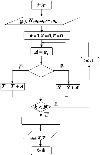 ,其中收入记为正数,支出记为负数。该店用右边的程序框图计算月总收入S和月净盈利V,那么在图中空白的判断框和处理框中,应分别填入_____,____.