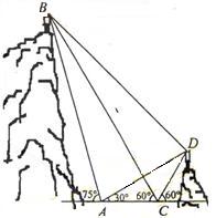 如图,A,B,C,D都在同一个与水平面垂直的平面内,B,D为两岛上的两座灯塔的塔顶。测量船于水面A处测得B点和D点的仰角分别为
