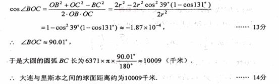 (2)求大连与里斯本之间的球面距离(结果精确到1千米)